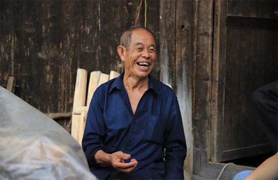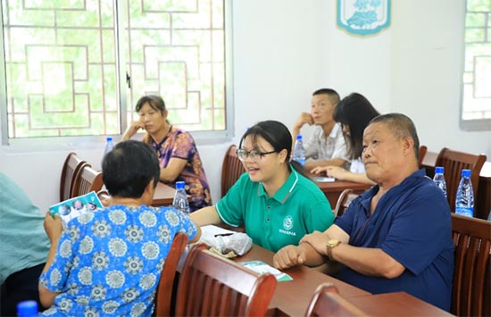 (在当地居民木屋前的石坪上,蛭惠民生团队成员正在与几位老人讨论山蛭对他们自身及其散养放牧的牛羊狗猪鸡等畜禽的危害情况)