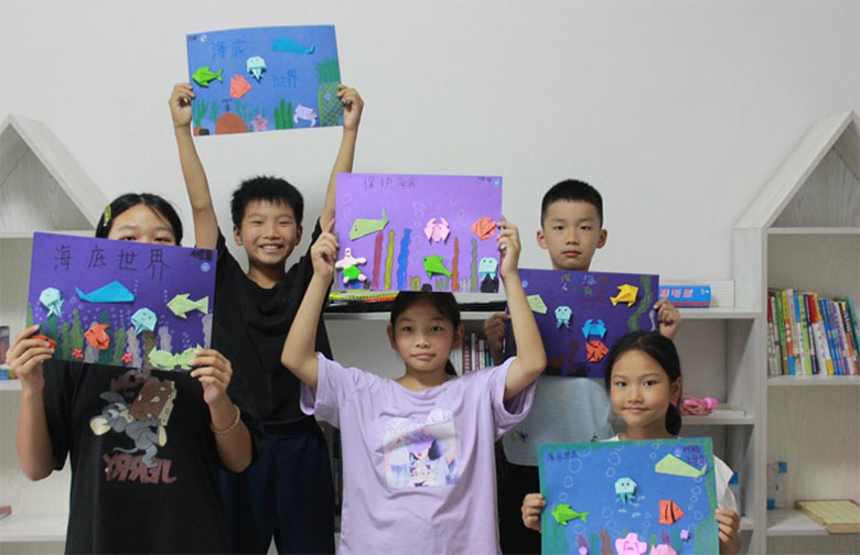 随后,志愿者们和孩子们挑选着自己喜欢的纸张,以保护海洋生物和环境为主题,制作出一副折纸作品。志愿者们以一对一的方式,一步一步地教孩子们如何折出自己喜欢的海洋生物,比如螃蟹,水母,鲨鱼等,就好像是赋予了它们崭新的生命,让他们真的回到了自己的家园,没有污染的蓝色家园。给孩子们强调保护海洋环境和保护海洋生物的重要性,提高孩子们的环保意识。