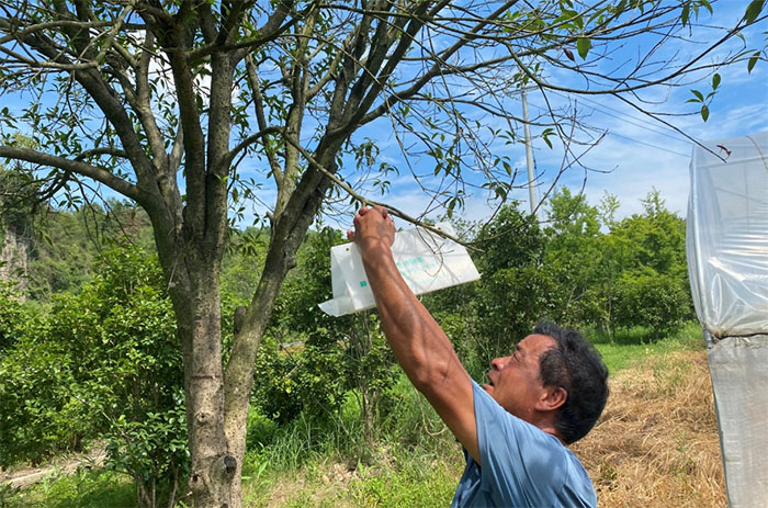 图为农户悬挂三角型诱捕器