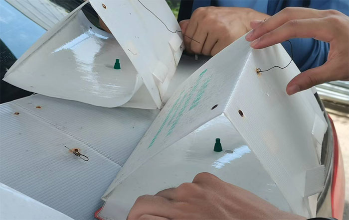 为应对这些虫害问题,团队在邓老师的指导下提出可行的解决方案。考虑到农户之前使用各种农药进行杀虫处理的效果并不好,所以团队推荐使用先进的绿色防控措施,如食源诱剂、食源饵剂、迷向技术和相关害虫诱杀剂,并改变连作的耕作制度。这里团队使用的是中捷四方公司提供的三角型诱捕器及其配套的昆虫信息素诱导芯和粘虫板进行虫害的预测预报,该引诱剂利用昆虫之间的信息素通讯进行引诱,能够有效监测虫害,并以此指导适期用药,来达到病虫害绿色防治的目标。