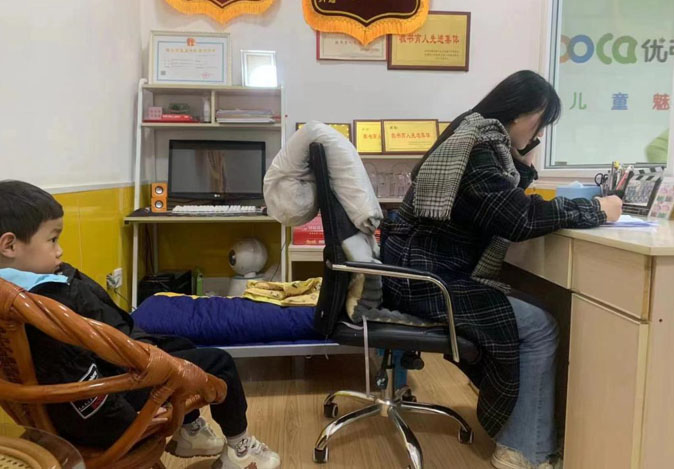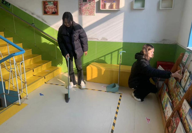 团队成员刘学彤、王炜杰给小朋友打扫卫生