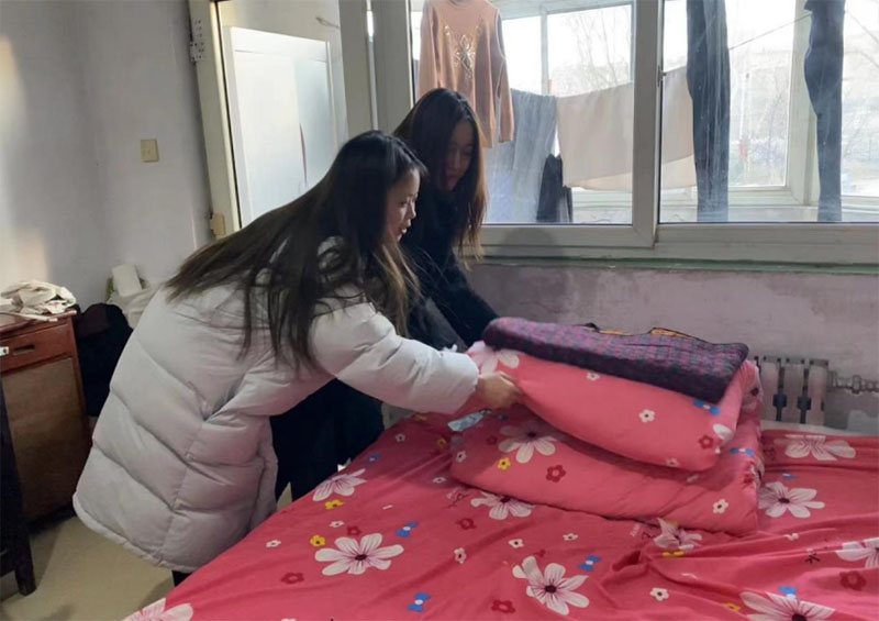 图为实践团成员整理老人的被子