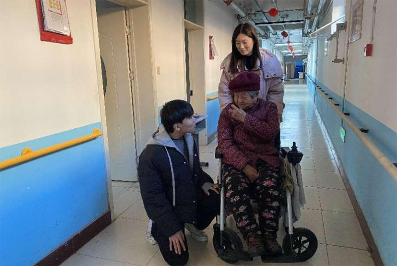 图为实践团成员为老人推轮椅