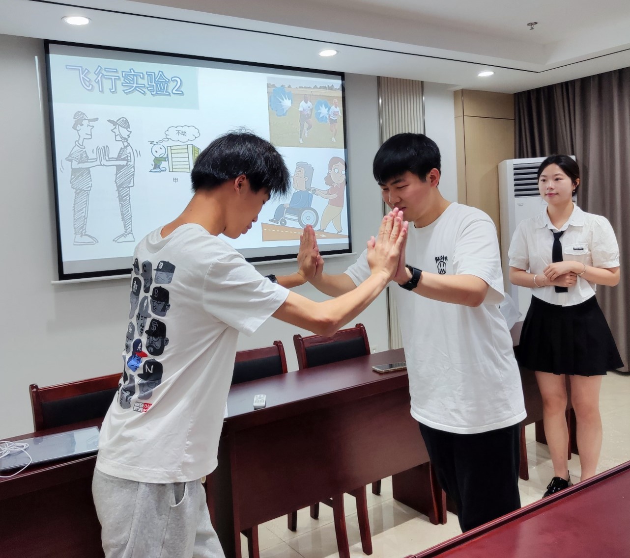 实践队员首先以飞机为切入点,通过展示物体自由落体运动和推阻力的科学小实验,鼓励孩子们积极发言分享自己发现的生活力学现象及运用。以知识讲解与互动问答相结合的形式带领孩子们一起学习相关物理力学知识。