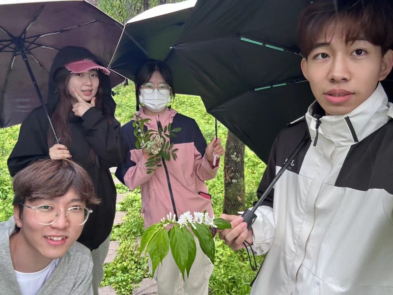 收集剪贴画材料时外面下着雨,团队成员身处树林中聆听自然的声音,沿路拾起落叶落花,实现自然资源的再利用。冒雨收集生态实践材料,团队成员心中满是对自然的敬畏与感激。雨水虽急,却洗净了尘埃,更凸显了生态文明的重要性,每一片叶子、每一滴水珠,都是自然赋予的宝贵财富,此刻,生态文明理念深入人心,更坚定了团队成员讲好生态故事、彰显东林学子兴林担当的决心。