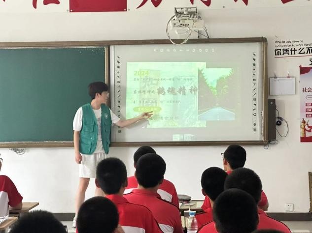 7月17日,团队成员前往齐齐哈尔市克山县第四中学围绕“鹤魂精神”进行了“绿色”主题宣讲,旨在让家乡青年深刻领悟习近平生态文明思想的鲜明主题是努力实现人与自然和谐共生,努力让绿水青山底色更亮、金山银山成色更足、开创天更蓝、山更绿、水更清的美丽中国建设新局面。本次宣讲也作为一次演练,团队成员积极调整后续实践内容,选择更细腻更深刻的方式讲述生态故事,让幼儿园的小孩子们更容易理解生态文明知识。