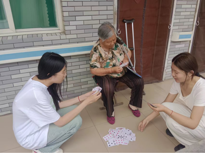 实践团成员与老人一边打牌,一边聊家常,搭建与老年人的沟通桥梁,让老年人真真切切感受到关心与关爱。