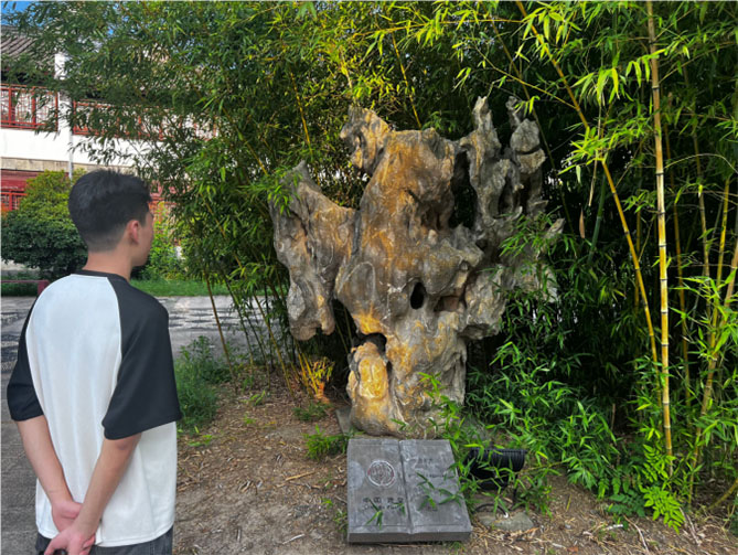 在灵璧奇石文化园内,实践团队还参观了主建筑物“汴阳楼”,这里是灵璧博物馆的所在地,珍藏了众多形色各异的灵璧石。漫步在古色古香的亭台楼阁之间,同学们仿佛穿越了时空,感受到了灵璧石文化的悠久历史和深厚底蕴。此外,文化园内波光粼粼的环形湖面和巍峨矗立的汴阳楼更是为这次文化之旅增添了几分神秘与浪漫。