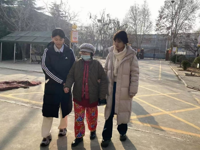 图为实践团成员巴紫涵张静茹搀扶老人散步