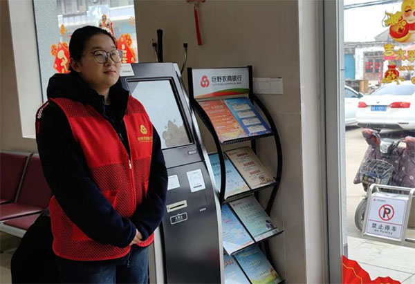 图为实践团成员李淑娟在巨野农商银行丁官屯支行门口