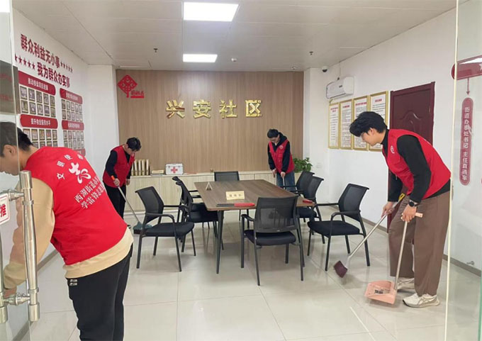 随后,实践团的脚步转向社区会议室。室内,团员们手持扫帚和拖把,对会议室进行了细致清理。一名团员弯腰擦拭桌角,另一人则小心翼翼地收拾角落的灰尘,动作娴熟而专注。窗外,社区工作人员不时探头观看,点头称许。清理完毕后,会议室焕然一新,空气中弥漫着清新的味道。团员们随即在室内摆放好桌椅,准备开展下一场宣传活动。