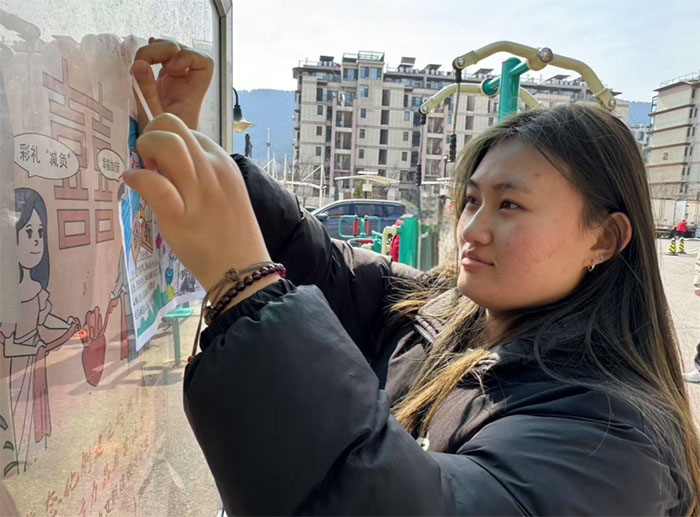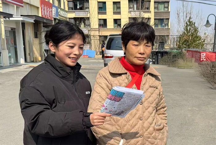 (图为实践团成员林佳佳在社区分发宣传资料)