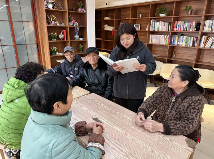 图为实践团成员宋慧聪在和老人们分享阅读经验