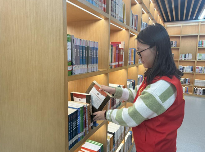 在图书借阅区,志愿者们将归还的书籍进行分类、登记,并按照图书馆的编号顺序整齐地摆放到书架上。为读者营造了一个整洁舒适的阅读环境。