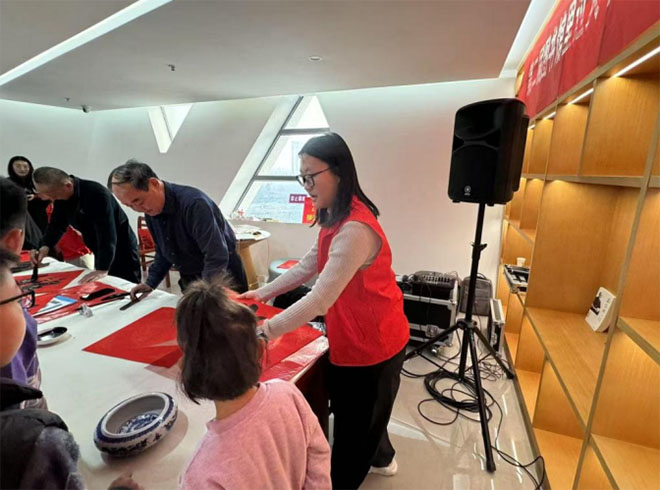 图为实践团成员孙小梅在春节期间协助写福字活动