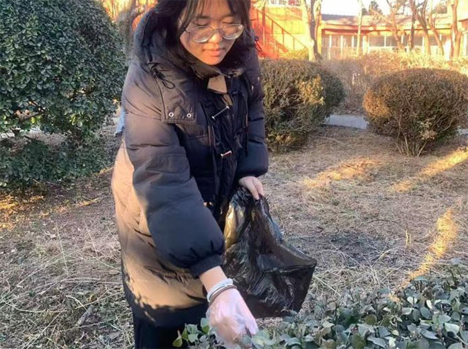图为“敬老尊贤”实践团孙盈打扫室外花园卫生