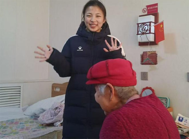 图为“敬老尊贤”实践团成员侯雨欣为老人表演“我爱北京天安门”