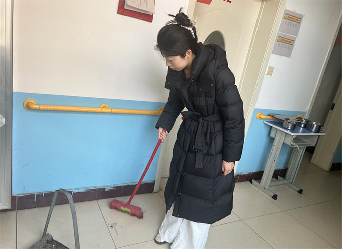 尤韶涵同学利用自己的医学知识,为老人们测量血压,关注他们的身体健康状况。王欣雅同学则负责打扫楼道卫生,确保公寓内的环境整洁美观。