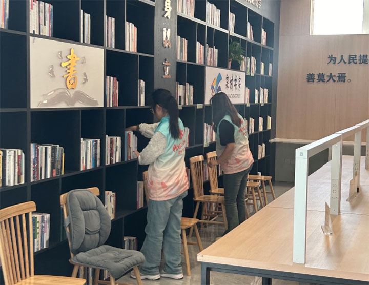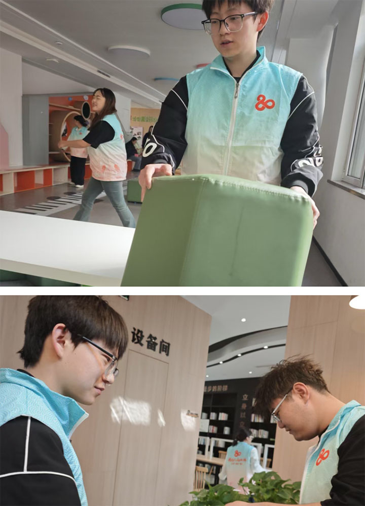 图为实践团成员整理活动室和图书馆