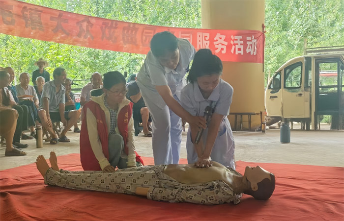 期间,实践团主动对接当地需求,融入戏曲园服务场景。在户外开阔场地,王樱润配合专业医护人员,搭建起简易教学区。以模拟人为教具,医护人员分步讲解心肺复苏要点,实践团成员在旁辅助演示,从轻拍双肩判断意识、解开衣物,到规范进行胸外按压、精准实施人工呼吸,每个环节都清晰呈现。村民们围拢观看,不时提问,王樱润与医护人员一同解答疑惑,推动急救知识真正贴近乡村生活,让村民遇到紧急情况时,多一份应对底气。