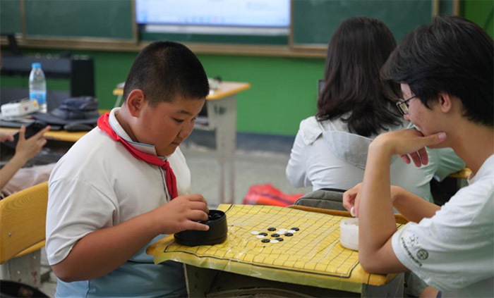 在支教校园的课间,五子棋成为了师生间的欢乐纽带。施老师的围棋课备受喜爱,而下五子棋更是人气爆棚。
