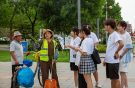 实践团成员与环卫工人交谈,中国青年网通讯员 李勇 摄。