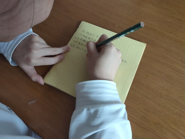 图为小朋友书写防溺水“六不准”原则。爱开大学生网通讯员 王源浩 摄