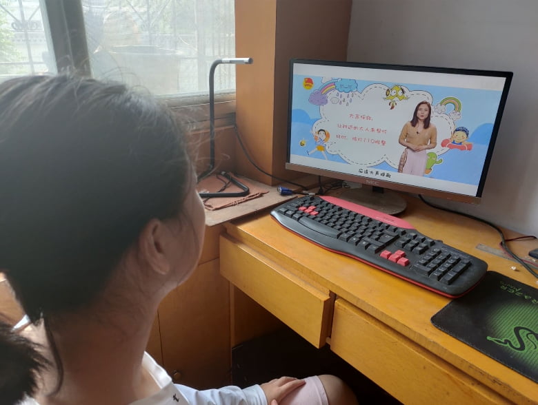 图为实践队员邀请小朋友观看防溺水安全教育视频。 爱开大学生网通讯员 王源浩 摄