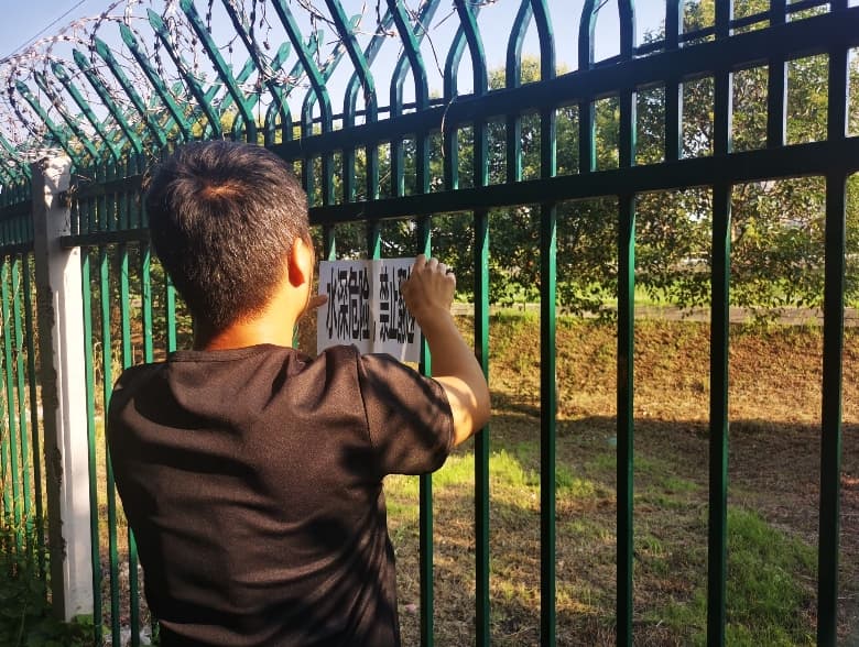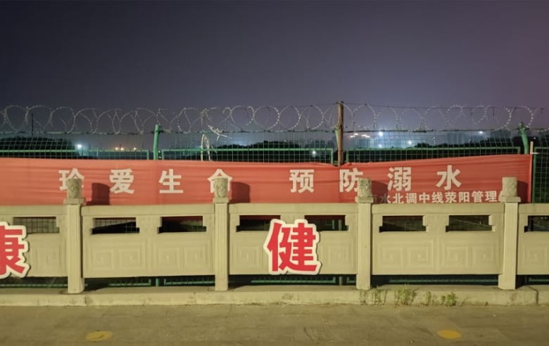 图为实践队员检查南水北调河域防溺水宣传横幅。爱开大学生网通讯员 周佳柠 摄