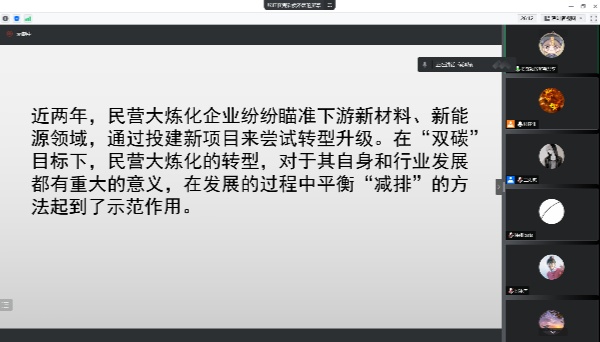 15号晚,实践队员通过腾讯会议开展线上会议,就各队员前期在各地对政府与企业方面的调研进行分享与讨论。首先,实践队员李梦迪向我们介绍了传统国有企业在双碳目标下的转型与发展,其中提到了未来煤炭行业结构调整所要面临的三大不变与两大改变,以及现阶段传统能源行业所面临的三大挑战与应对策略。之后,实践队员王先祺向我们介绍了近期由腾讯牵头,联合科创可持续发展研究院联合举办“双碳重创“活动,并创立”零碳学院”,从而建立以碳中和共荣生态为核心的双碳实践服务示范平台,为企业实行双碳政策赋能。该活动受到大中小企业及政府部门的支持,是我国企业在双碳背景下为转型发展努力的典型代表。随后,实践队员侯泽颖以民营大炼化转型为例,进一步分析了企业的转型之路。由于石油炼制、轻氢裂解等大型炼化项目碳排放量过大,民营大炼化企业纷纷瞄准下游新材料、新能源领域。同时,企业也将放眼长远,把握减碳节奏,制定短期长期战略计划。除了企业的努力外,还有国家政策的支持与行业协会的指导。而实践队员邵云霄则聚焦贵州工程中的一项新技术—煤层气的开发与利用。将煤层气转化为可使用的,在一定程度上减少了在开采过程中的碳排放量。段冰颖则介绍了当地政府的一项双碳政策,政府召开双碳工作领导小组全面部署会议,成立工作专班,该工作专班的工作包括科学引领规划、摸清碳排放现状、制定全社会减碳计划等等。这是全国各地政府为响应双碳政策所作努力的缩影。当然双碳其实就在我们身边,实践队员侯懿峰介绍了青岛住建局践行双碳,探索城市绿色发展的系列举措。包括以“节能保暖工程”为例的绿色节能计划,以实现五个零(零垃圾、零废水、零废弃、零废热、零能耗)为代表的绿色建材,为绿色企业提供经济支持为目的的绿色金融。最后,陈思达则总结了全国各省十四五规划中的双碳目标及规划,使实践队员对政府做的工作有了整体认识。