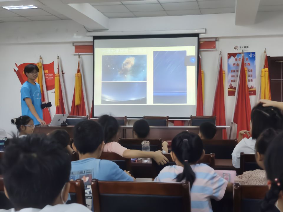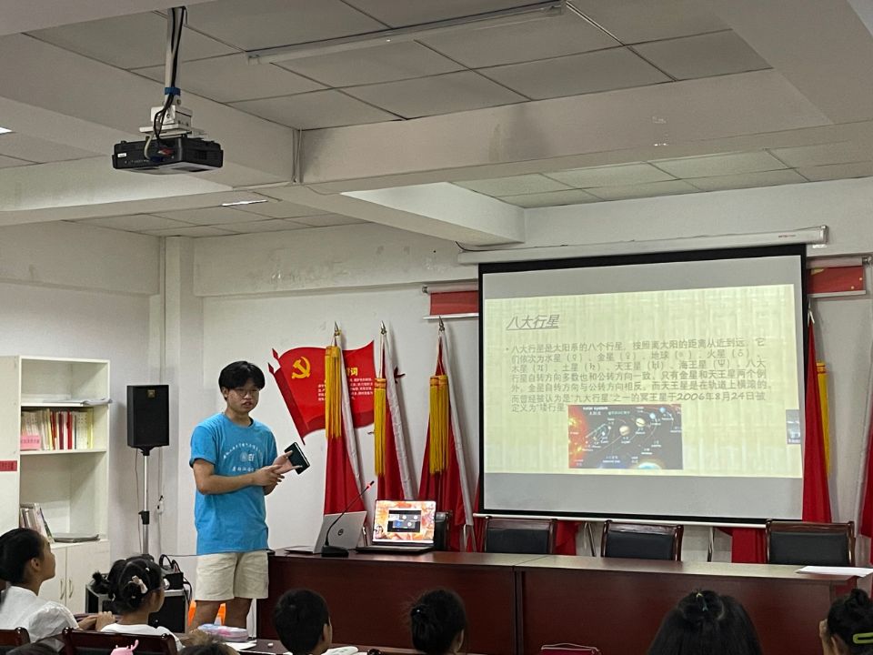 实践队员们通过PPT、视频向小朋友们介绍了八大行星的特点、行星的地貌和气候,以及行星所处的宇宙环境和形成过程等天文知识。小朋友们兴趣高涨,纷纷举手提问,并与实践队员们分享自己了解到的天文知识。