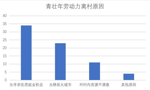 在村内建设良好的基础上,为探究青壮年劳动力流失原因,实践团针对72名家中有青壮年常年离村务工的村民设置为寻求优质就业机会、为移居大城市、对村内资源不满意、其他原因四项选择,如下图所示,可以看出寻找优质就业机会约占50%。