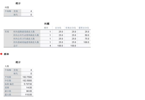 再通过统计运行分析如下图得出四项建设满意人数均值为102.75,占总样本人数:102.75÷114=90.1%