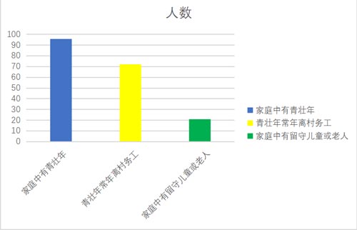而另一方面,为探究村内青壮年劳动力问题,实践团首先设置家中是否有青壮年问题初步筛选针对人群,再通过家中青壮年是否离村务工、家中是否有留守老人或儿童两个问题从正侧面两个角度保证准确性,再利用Excel分析村内青壮年劳动力数据,如下图所示,可得村内青壮年生产力向外流失较为严重。
