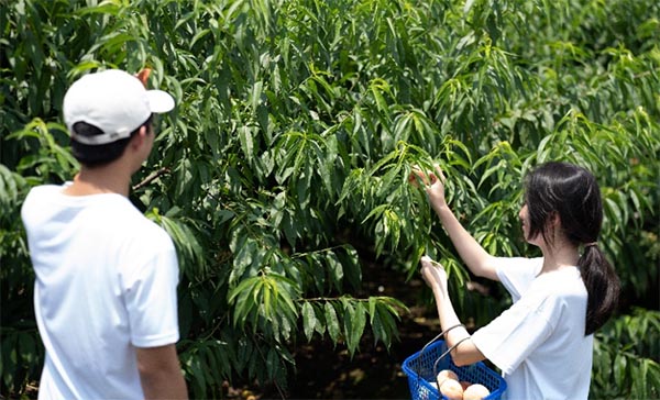图为实践队成员在农场采摘水蜜桃(王瑞齐 摄)