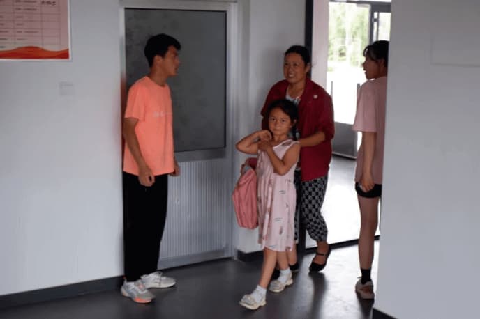 开展爱心支教活动的消息后,将适龄学生送到民安驿站。实践团成员迎接前来辅导的学生,并了解其学习科目及进程,为开展精准支教活动提供前提保障。