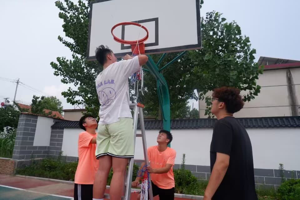 与此同时,侯明杰带领球馆两位球员同实践团成员以及洼子村学生开展了激烈的篮球联赛。比赛开始前,由侯明杰与实践团成员一起为篮筐换上全新篮网,象征全新开始。