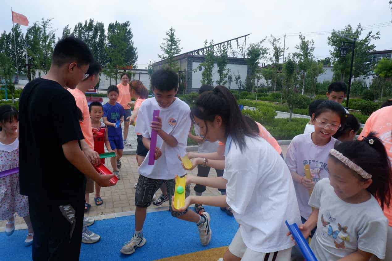 此次比赛将实践团成员与洼子村孩童随机分为四组,每组通过PVC管将球运往终点处的篮子里,用时最短的队伍获胜。赛前每组成员积极练习,相互配合,制定合理高效的比赛策略。