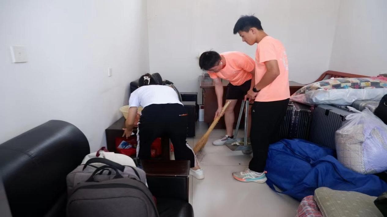 图为后勤组成员打扫洼子村办公室卫生