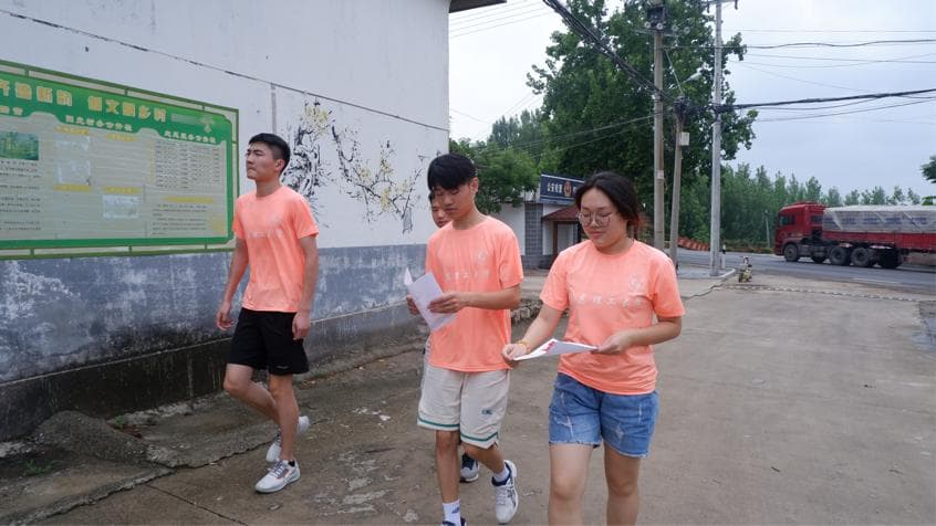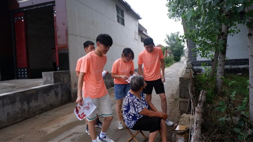 图为“芒果行动”实践团走访村民宣传反邪教知识的场景