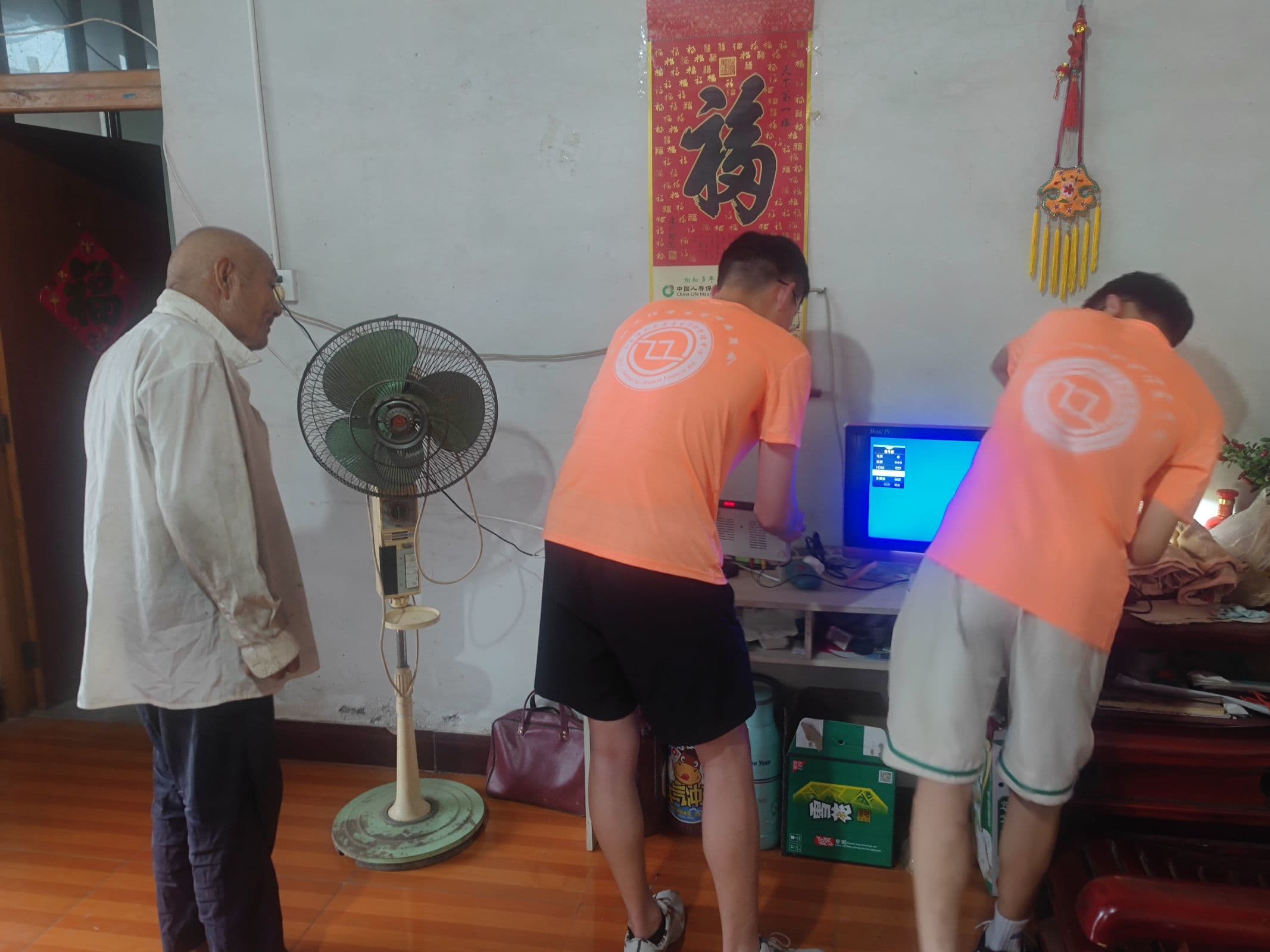 “关爱空巢老人,心系老人需要,我们在行动。”实践团成员深入走访洼子村一户留守老人的家中,询问其所遇生活问题。聊天过程中,实践团成员了解到,老人和老伴两人独自在家,子女长期在外工作,老人家中的电视机没有信号也寻找不到维修人员。实践团成员听到诉求后,毫不犹豫地答应帮忙修理电视机。