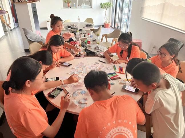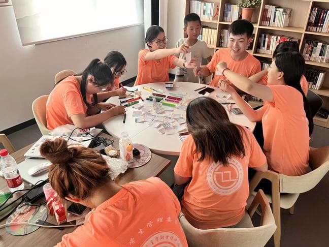图为“芒果行动”实践团成员制作便签时学生前来学习参与制作的场景