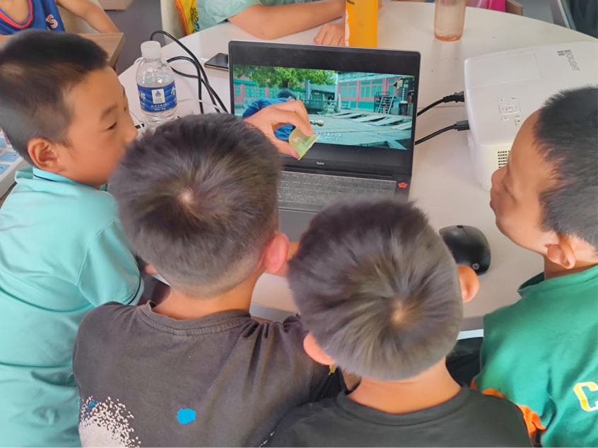 图为“芒果行动”实践团组织中小学观看《我和我的祖国》时,学生们围在一起讨论祖国事件及爱国人士的场景