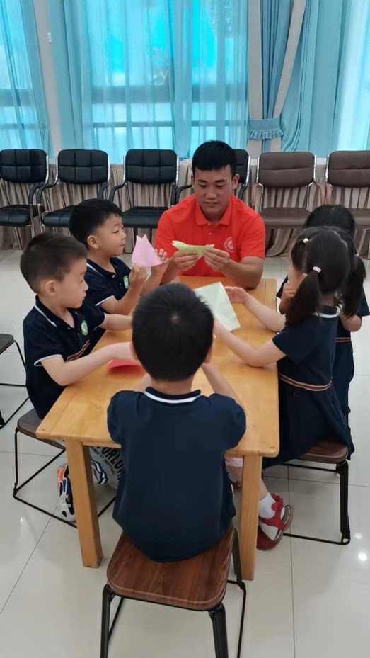图为队员们教小朋友们制作折纸火箭,激发孩子们对两弹一星的兴趣。通讯员 王雨婷 摄
