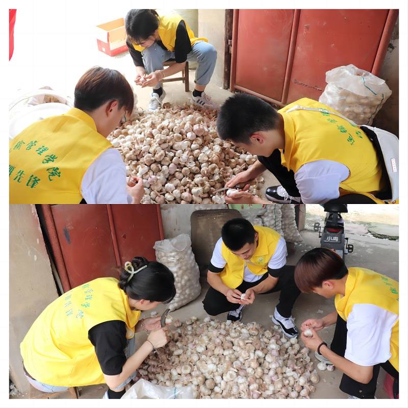 7月9日下午,在郑书记的带领下,实践团师生们分成两组行动。一组走进了一位中考学子家庭,开展学业帮扶实践活动。该中考生因未考入理想的高中而心生厌倦,情绪低落。实践团的师生们与该学子进行谈心交流,共同查找当地相关学校资源,引导其树立自信心,找到适合自己的赛道。最终该学子积极填报了其他学校,找到属于自己的人生目标。一组走进大蒜种植户家庭,开展劳动实践活动。该农户家中尚有几百斤的蒜头正需完成初加工,大家便在当地同学的示范下,亲身体验了大蒜去根、剥皮等一系列“美白”处理,过程中队员们分工协作、耐心细致、铆足干劲,经过近两小时的忙碌,百来斤的蒜头全部完成“瘦身”,减轻了困难户的负担。