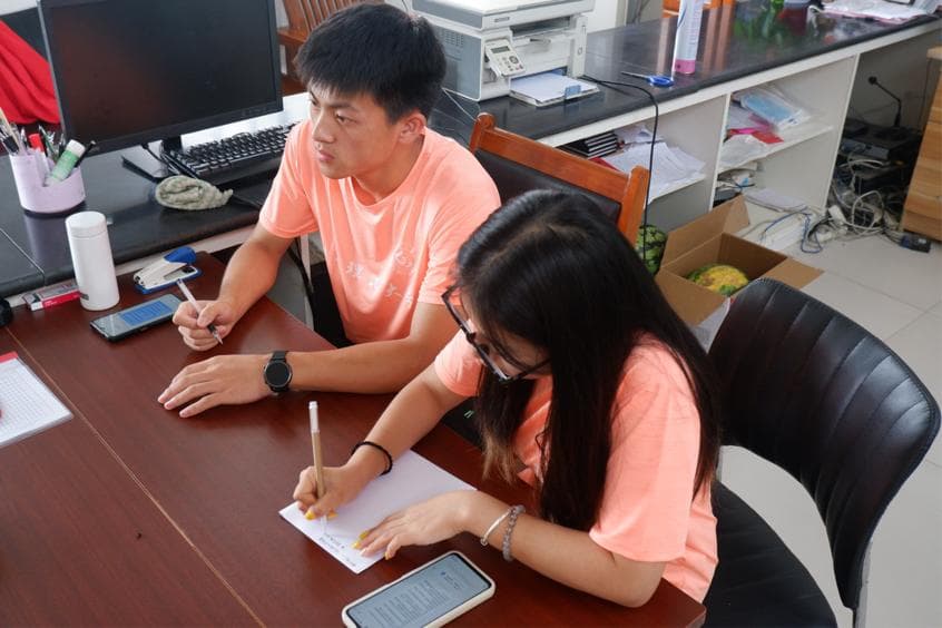 图为“芒果行动”实践团对书记孙庆梅讲解的洼子村医疗文化体系建设内容认真做笔记的场景