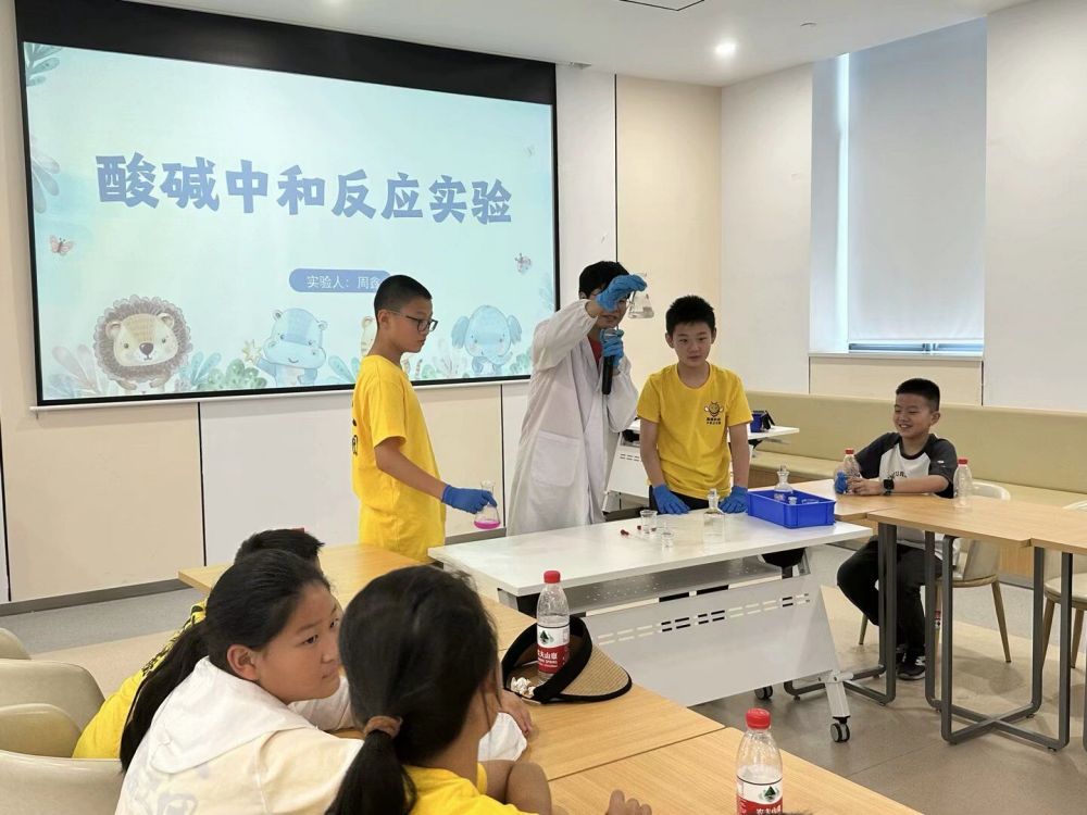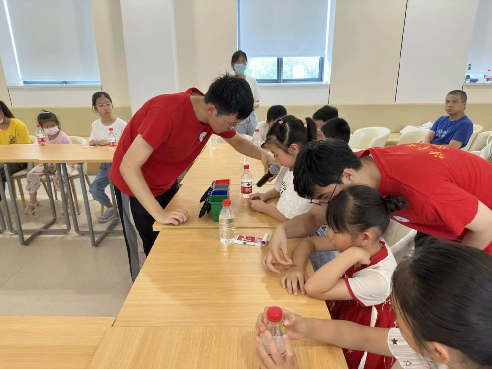 图为实践队队员请小朋友们上台一起进行实验