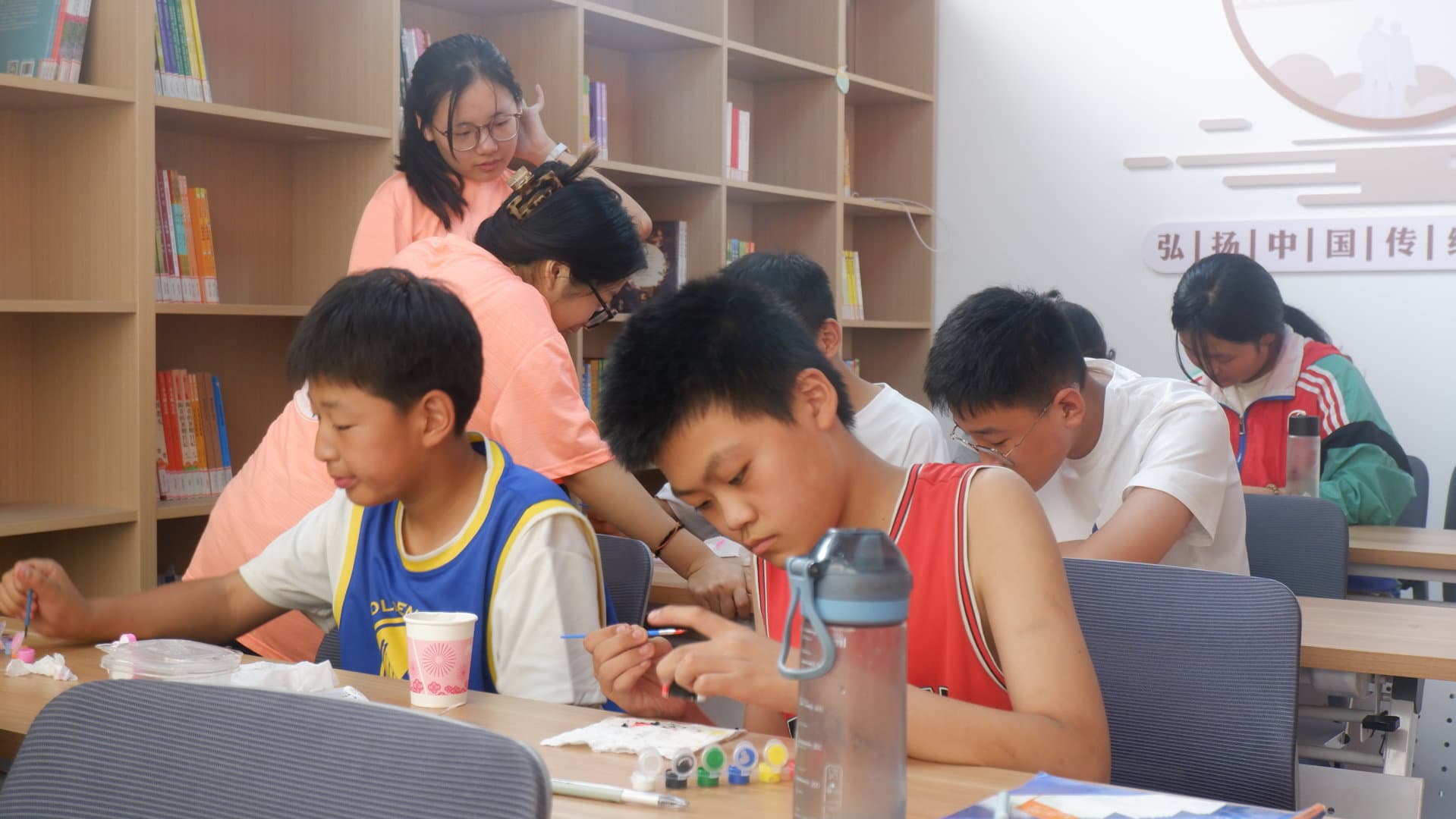 图为实践团成员与同学们一起做手工