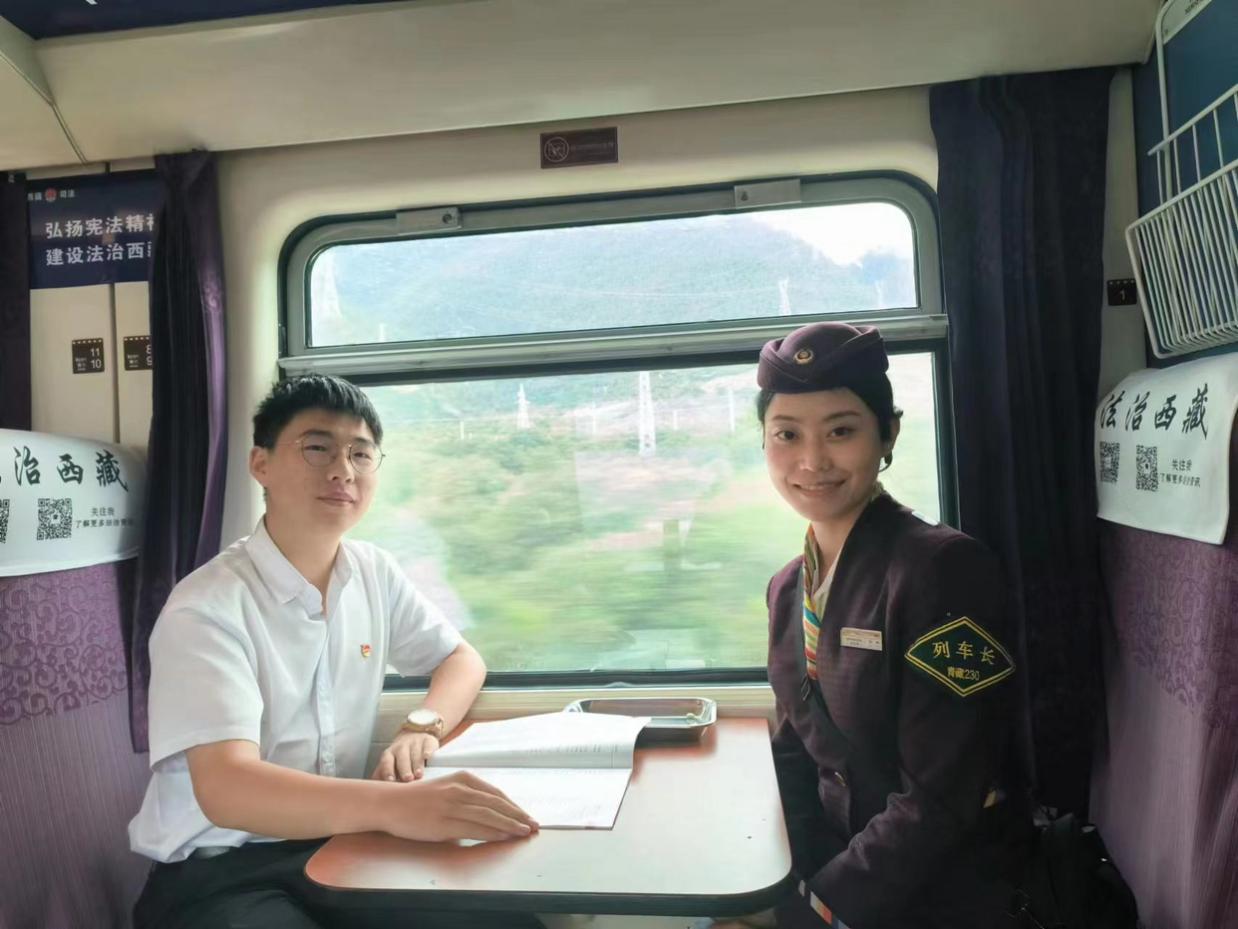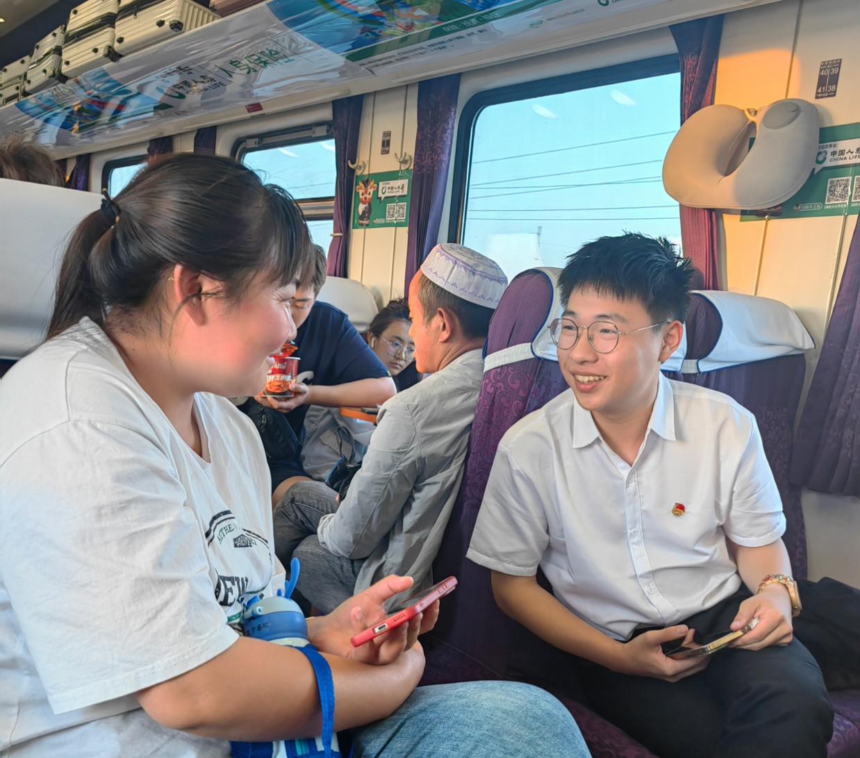 闲唠家常会民情这一路上,团队成员与同行的旅客朋友们相谈甚欢,在列车途径各个站点的青藏线旅途中,与不同的旅客“面对面,心贴心”的交流,闲聊家常的同时,了解民情农情,为后续社会实践打下坚实基础。正所谓“知屋漏者在檐下,知政失者在朝野”,只有深入群众、与群众贴心交谈,才能发现当地群众的共性问题和亟待解决的需求。而深入群众不仅仅是拿着笔记本入户走访,是田间地头边干农活边唠嗑,也是漫长旅途中的闲谈,是吃农家饭听农家事,也是走街串巷多听细看,才能真正把好事办实,把实事办好,才是团队远赴西藏的初心所在。