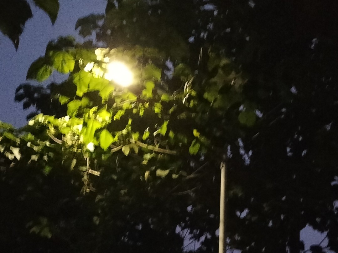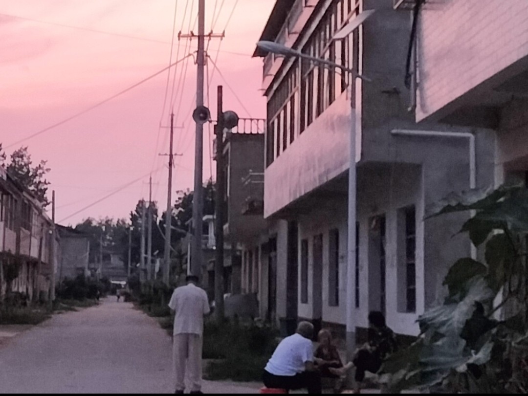 图为实践队员在晚上19:40拍摄村民在路灯边上聊天,路灯不亮晚霞明。通讯员 褚艳雨 摄